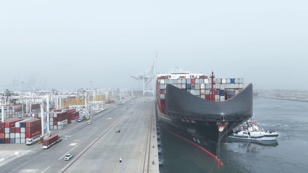 افتتح التشغيل التجريبي باستقبال سفينة الحاويات العملاقة ESSEN EXPRESS التابعة للخط الملاحي العالمي Hapag-Lloyd القادمة من ميناء أمبرلي بتركيا، ويبلغ طولها 366.5 مترًا، وعرضها 48 مترًا، وغاطسها 15.5 متر، بطاقة استيعابية تصل إلى 13,177 حاوية مكافئة (TEU)، وحمولة إجمالية نحو 143,262 طن.