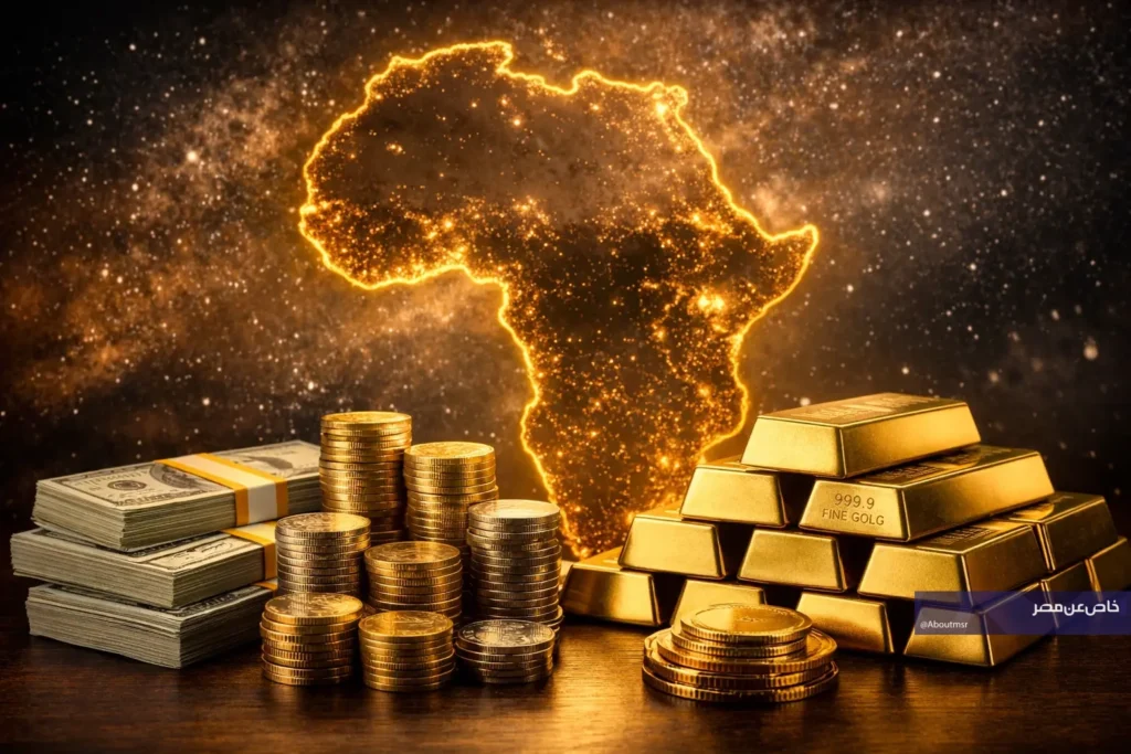 رسم توضيحي يمثل الثروة، يظهر سبائك ذهب مكدسة وأوراق نقدية وخلفية لخريطة أفريقيا، فيما يرمز إلى الازدهار المالي