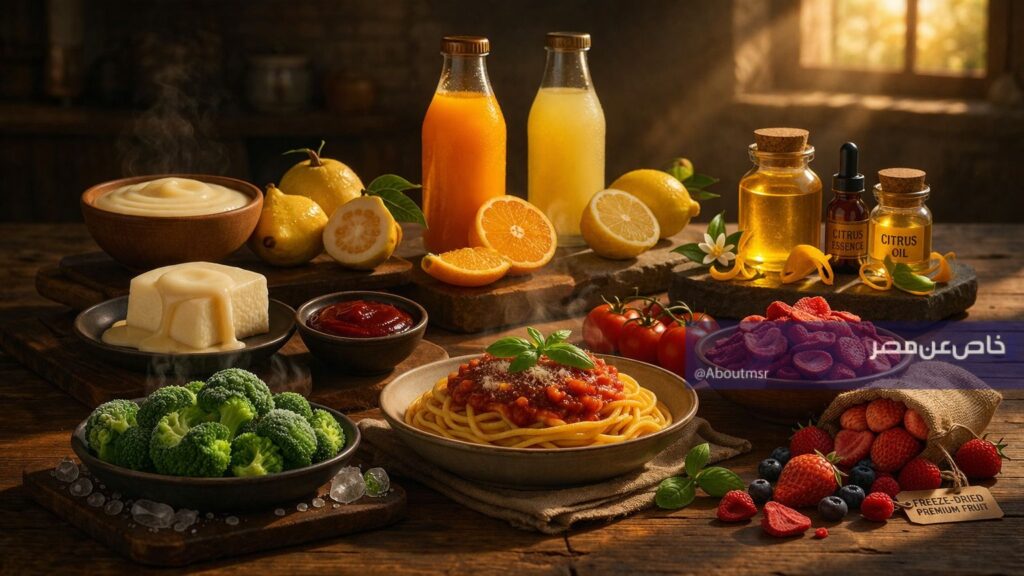 تشمل قائمة منتجات المشروع مجموعة واسعة من المكونات الغذائية أبرزها مهروسات الفواكه مثل الجوافة والفراولة ومركزات البرتقال والليمون والطماطم إلى جانب الخضروات والفواكه المجمدة بتقنية IQF والزيوت العطرية ومكونات النكهة.